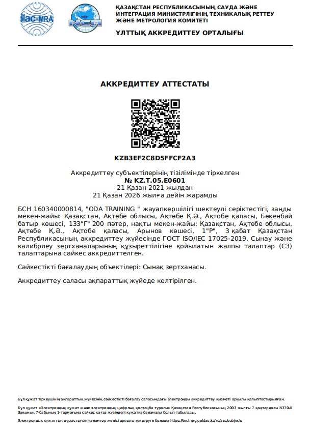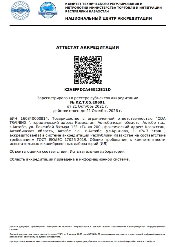 Компания имеет в своем составе испытательную лабораторию ТОО «ODA TRAINING» аккредитованнyю в системе Аккредитации Республики Казахстан на соответствие требованиям ГОСТ ISO/IEC 17025-2019 «Общие требования к компетентности испытательных и калибровочных лабораторий» (ИЛ) Аттестат аккредитации № KZ.T.05.E0601